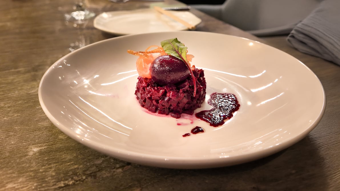 El convite inició con una tartar de remolacha, resultado de una cocción de cinco horas, sazonado con una alioli de ajo asado y acompañado de huevo de codorniz, salmón ahumado y chalotes. Una entrada refrescante, a decir del chef.