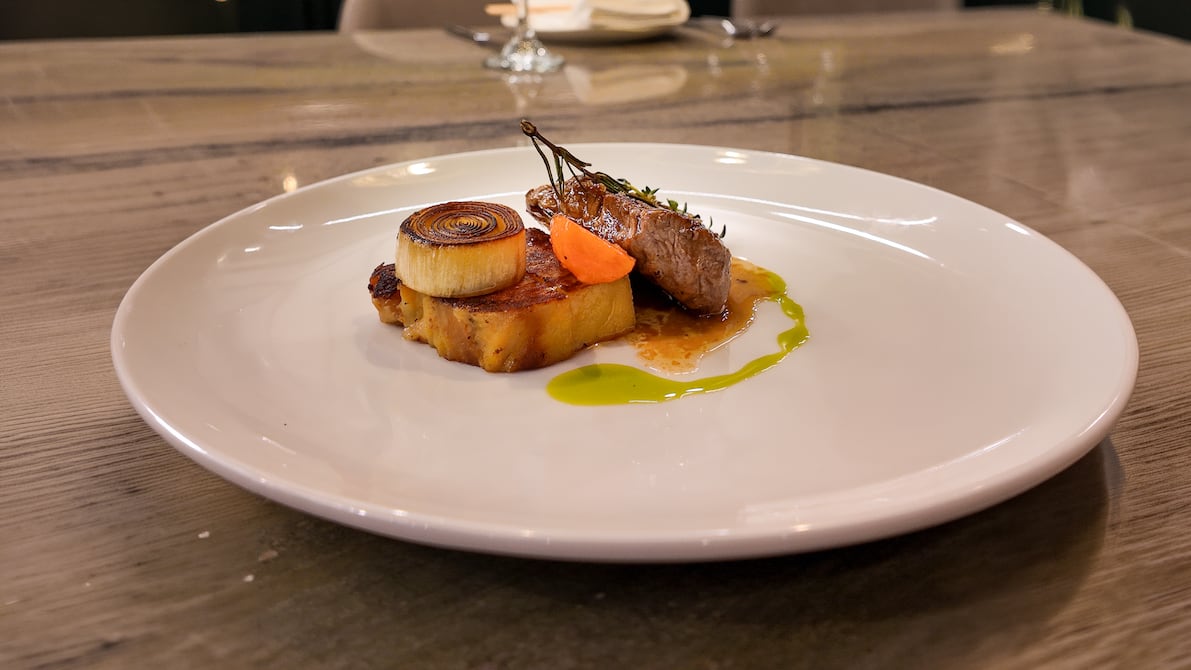 Le siguió un boeuf Chateaubriand, como plato fuerte. Se trata de un corte premium (lomo fino), de 140 gramos, servido con papa gratinada a modo de milhojas con queso y crema, verduras, y una intensa salsa demi-glace, de huesos, hierbas, coñac y estragón, que requiere tres días de cocción.