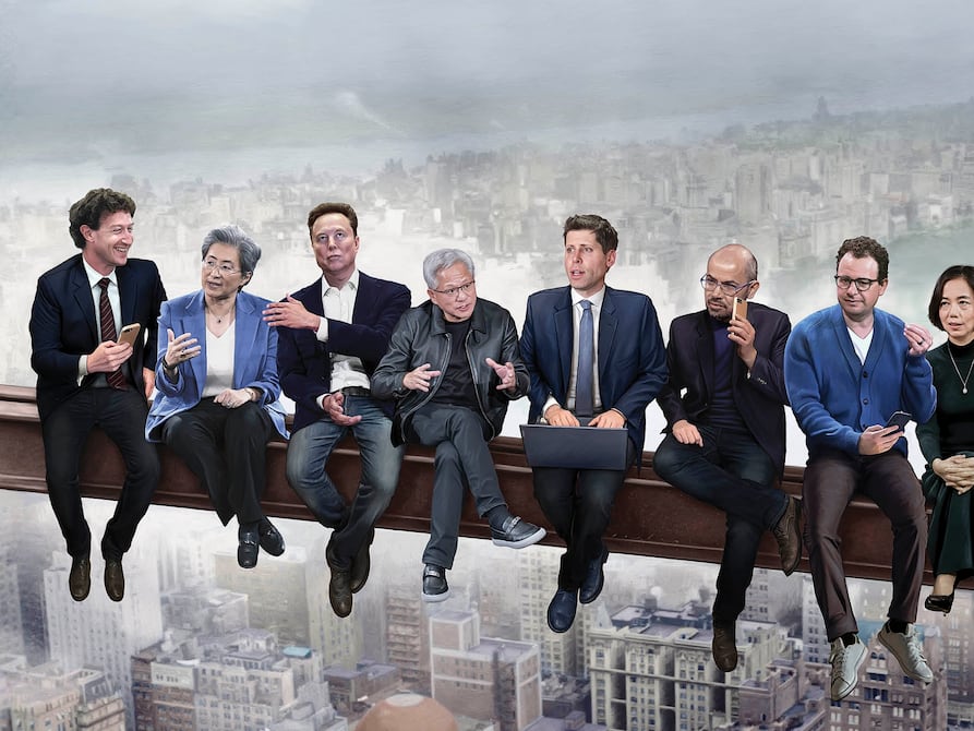 En esta reinterpretación aparecen Zuckerberg, director ejecutivo de Meta; Lisa Su, líder de AMD; Musk, director de Tesla, SpaceX, fundador de xAI y cofundador original de OpenAI; Huang, director ejecutivo de Nvidia; Altman, director ejecutivo de OpenAI; Satya Nadella, líder de Microsoft; Demis Hassabis, director ejecutivo de Google DeepMind; Dario Amodei, líder de Anthropic; y Fei-Fei Li, codirectora del Instituto de IA de la Universidad de Stanford.