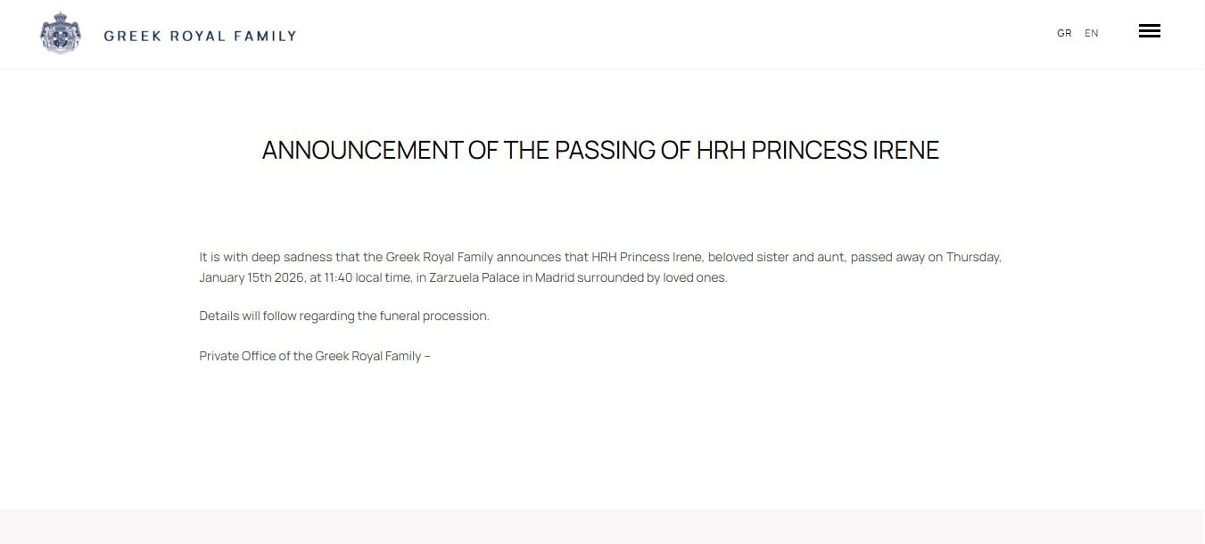 La princesa Irene de Grecia, hermana de la reina emérita Sofía de Grecia, falleció este jueves 15 de enero en Madrid, a los 83 años, en el Palacio de la Zarzuela, donde residía desde hace décadas.