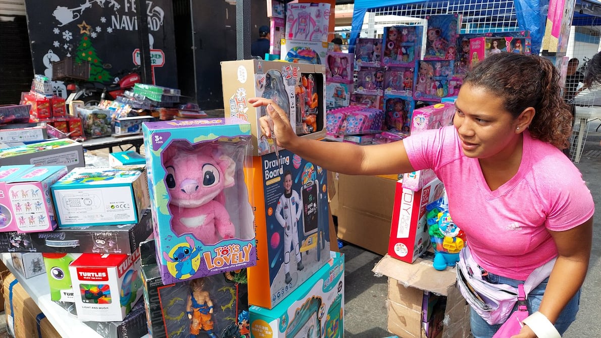 En otros puestos, la variedad es amplia. Rosa Puebla destaca la venta de muñecos interactivos. “Se están llevando los Stitch que caminan y bailan, las Barbies, cocinitas. Los precios van desde $ 10 hasta $ 20”, explica.