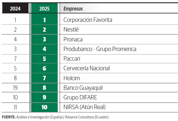 En el Top 10 se consolidan en las dos primeras posiciones Corporación Favorita y Nestlé. La primera impulsa el programa Sé O2, que busca involucrar a proveedores y comunidad en la cuantificación de su huella de carbono y establecer metas de reducción. Entre sus objetivos está reducir el 42% de sus emisiones de gases de efecto invernadero hasta 2030, mediante el uso de energía renovable, optimización logística y nuevas tecnologías.