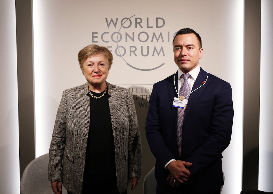 “Excelente reunión con el presidente Daniel Noboa en Davos. Conversamos sobre el sólido desempeño del programa de Ecuador y su compromiso con las reformas que impulsan la estabilidad y el crecimiento. El FMI está dispuesto a seguir apoyando los esfuerzos de Ecuador”, publicó Georgieva.