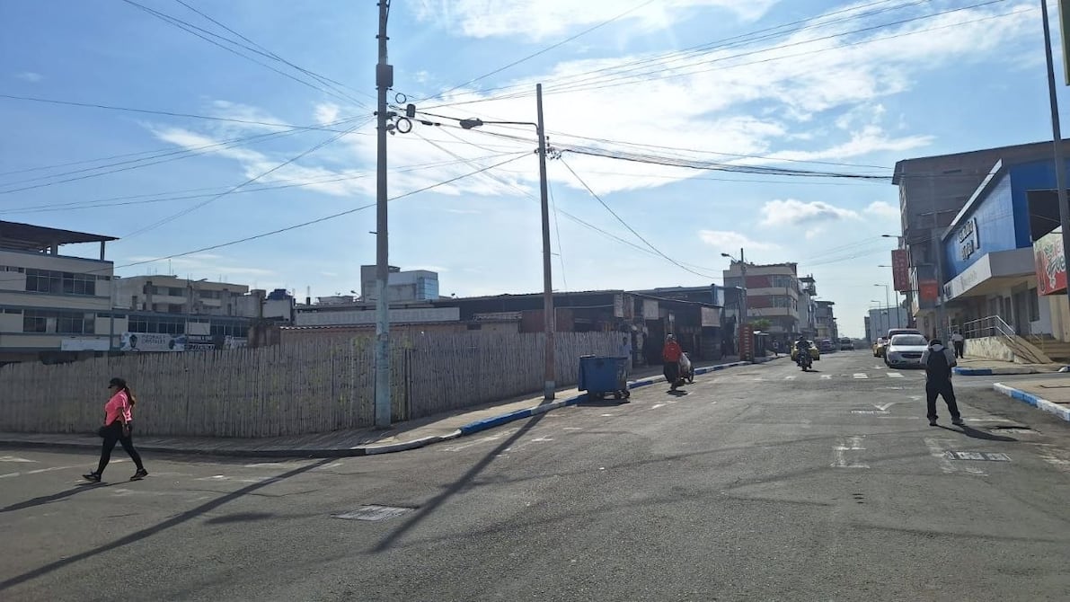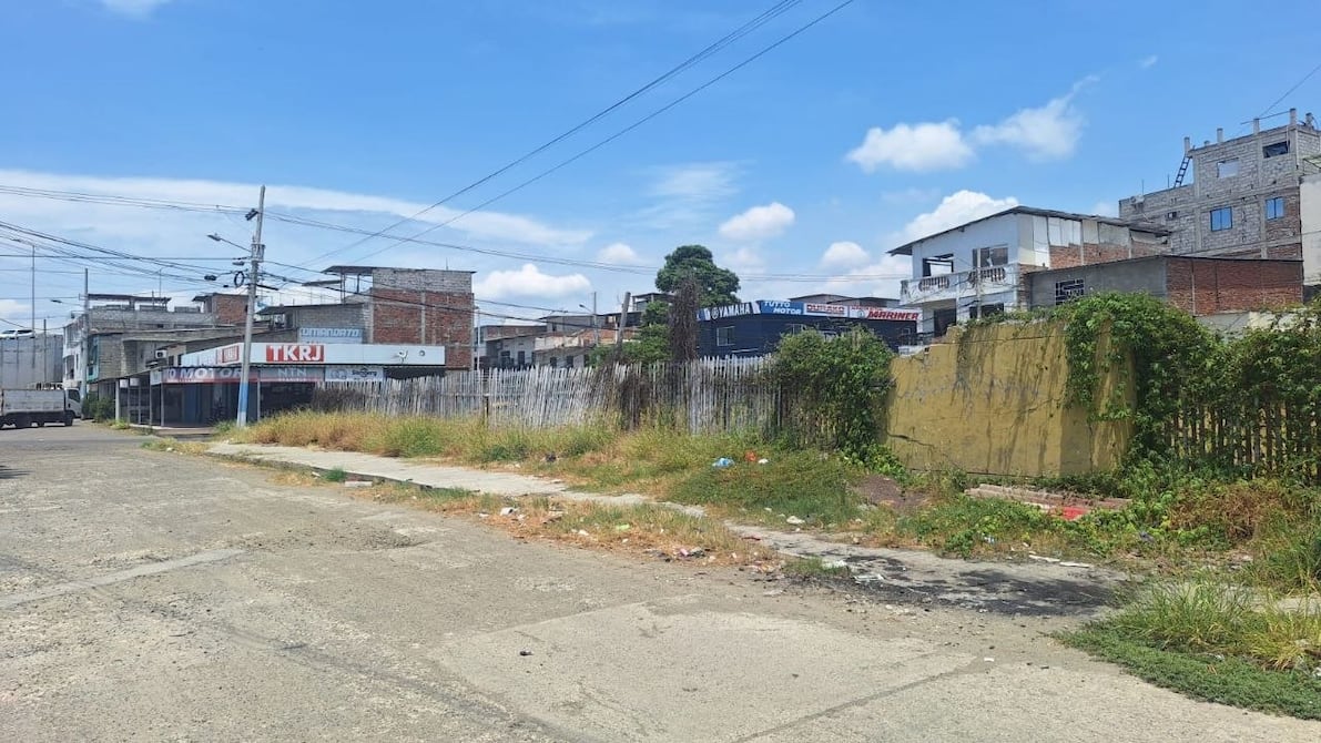 Esquina de la avenida 108, en el centro de Tarqui, donde quedaba el edificio del Banco Pichincha y, a los lados, el centro comercial Felipe Navarrete, en Manta. Actualmente, el terreno está vacío.