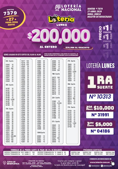El número ganador de la Lotería Nacional del sorteo 7379 es el 10313, que premia al entero con $ 200.000.