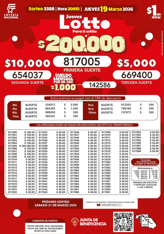 Estos son los resultados del sorteo 3388 del Lotto, de la Lotería Nacional, que se realizó el 19 de marzo de 2026.