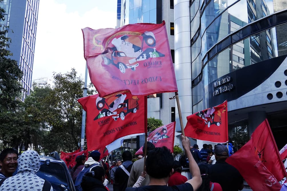Sindicatos de trabajadores realizaron un nuevo plantón en los exteriores del Ministerio del Trabajo, en Quito, la tarde de este jueves, 24 de julio de 2025.