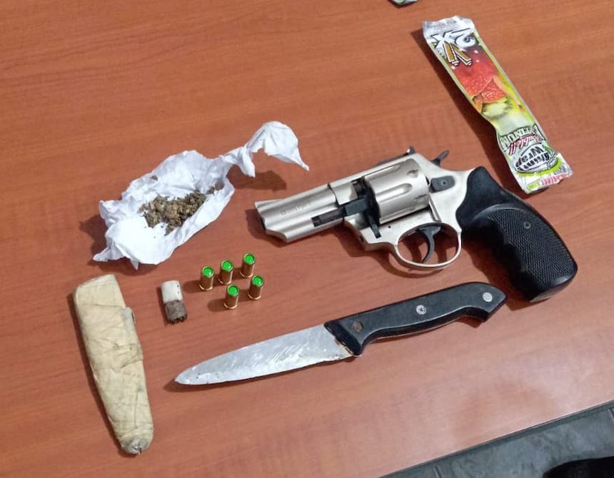 Durante la inspección encontraron el revólver con seis cartuchos, un cuchillo y la sustancia que sería marihuana.