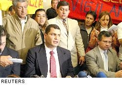 El ex ministro de Economía, Rafael Correa, en rueda de prensa, reconoció esta tarde que hubo fuertes presiones internacionales para no negociar con Venezuela. Además, aseguró que el presidente de la República, Alfredo Palacio, está rodeado de asesores que lo aconsejan mal.