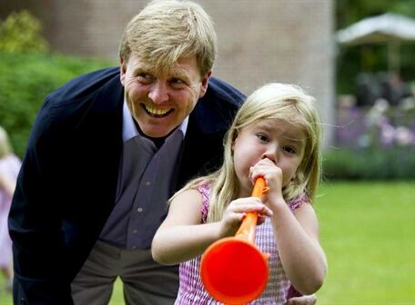 La princesa Amalia (d) sopla una vuvuzela junto a su padre el príncipe Gulliermo-Alejandro de Holanda durante una sesión de fotos en su residencia en Wassenaar, Holanda. Foto: redaccion