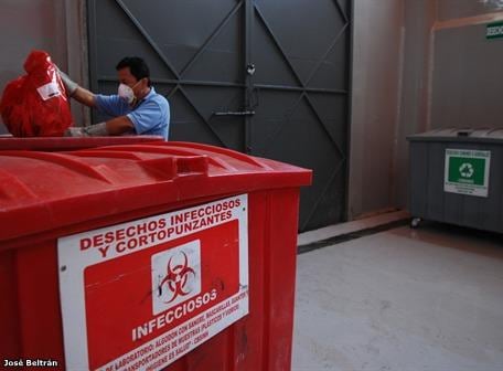 Tres contenedores para desechos comunes y dos para infecciosos son parte del equipo de la remodelada área de almacenamiento final y clasificación de residuos del Instituto Nacional de Higiene (INH) Leopoldo Izquieta Pérez.