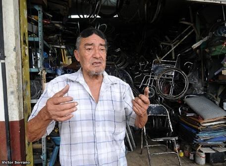 A pesar de que su visión nublada por las cataratas en los ojos le impide observar claramente lo que pasa en su alrededor, Vicente Jurado, de 76 años, continúa fabricando y arreglando sillas de ruedas.