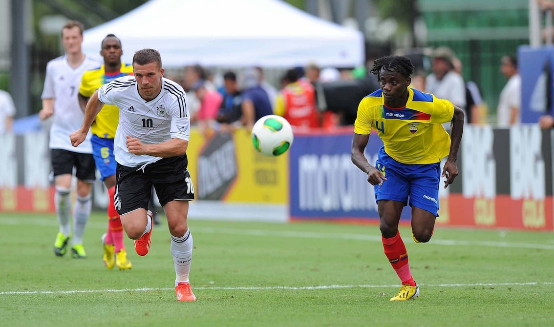 El delantero Lukas Podolski marcó hoy uno de los goles más rápidos en la historia de los partidos internacionales en la victoria de la selección alemana 4-2 sobre Ecuador, en un amistoso en el que el ganador mostró jugadores alternantes.