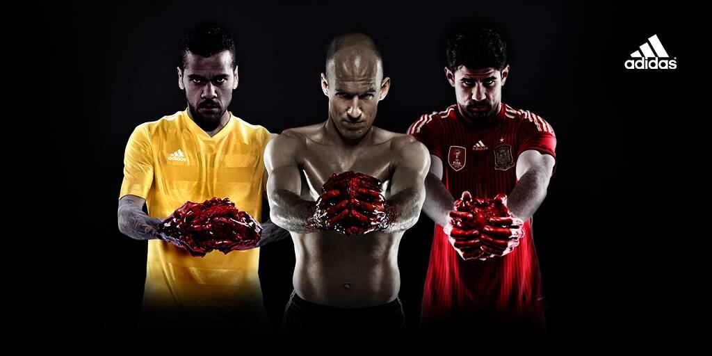El fabricante de ropa deportiva adidas desató una polémica con una campaña al Mundial de fútbol de Brasil en la que se ve a estrellas como el español Diego Costa, el brasileño Dani Alves o al holandés Arjen Robben, sosteniendo corazones llenos de sangre.