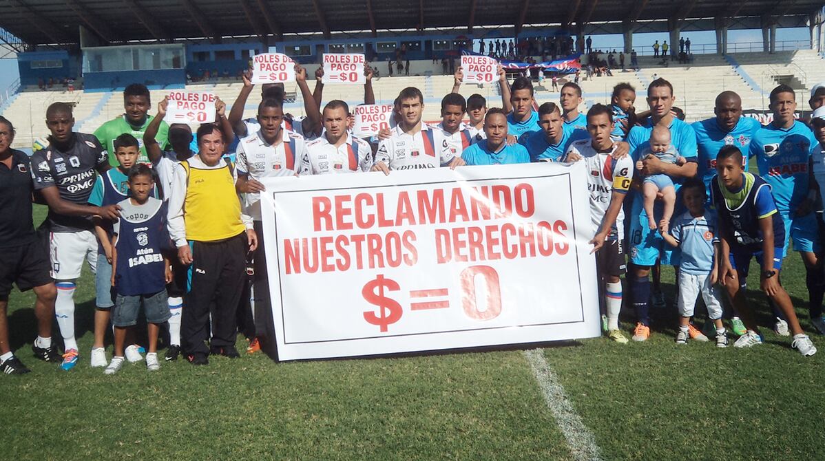 El cartel exhibido en Manta el sábado anterior volvió a acompañar a los jugadores del Deportivo Quito en la habitual rueda de prensa de los martes.