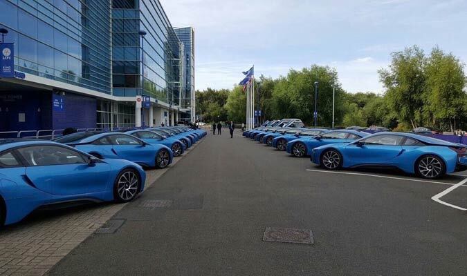 Primero fueron pizzas; ahora son los mejores autos deportivos. Una flota de 19 automóviles BMW i8 -cada uno con valor de alrededor de 135.000 dólares- se alineó este viernes por la mañana afuera del estadio del Leicester como un premio para los jugadores por su hazaña de conquistar la Liga Premier la temporada pasada.