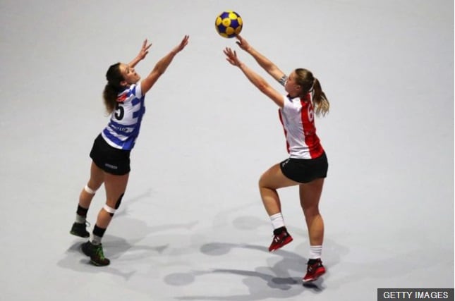 Es un día normal en el colegio: un grupo de niños vestidos de rojo, verde y amarillo juegan con una pelota en la mitad del patio de un colegio.