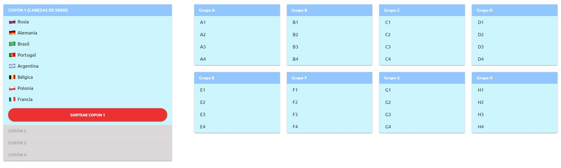 Este viernes se realizará el sorteo de los grupos para el Mundial de fútbol Rusia 2018, pero antes de conocer cómo quedarán agrupados los 32 países que competirán en la fase final de ese torneo, usted puede jugar con un simulador para que visualice cómo podrían quedar conformados los ocho grupos.