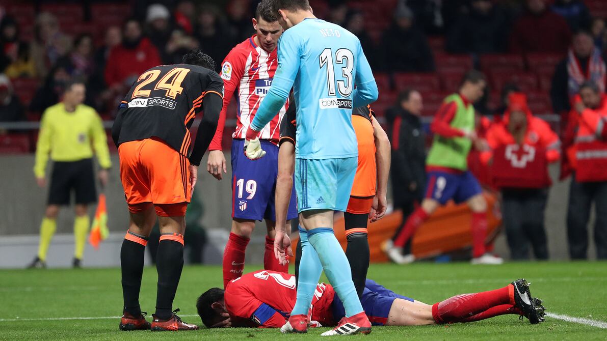 Godín se quedó tendido en el terreno de juego y fue rápidamente atendido por el médico del Atlético que pidió su cambio en el minuto 50, sustituido por Juanfran.