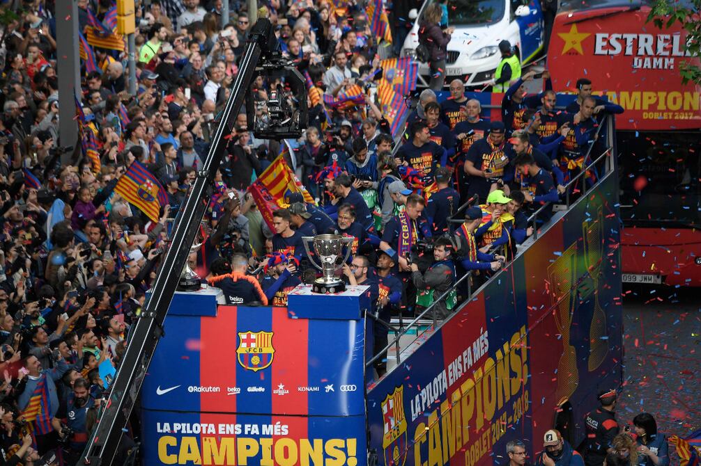 El FC Barcelona festejó sus títulos de La Liga española y la Copa del Rey con un desfile por las calles de la ciudad este lunes.