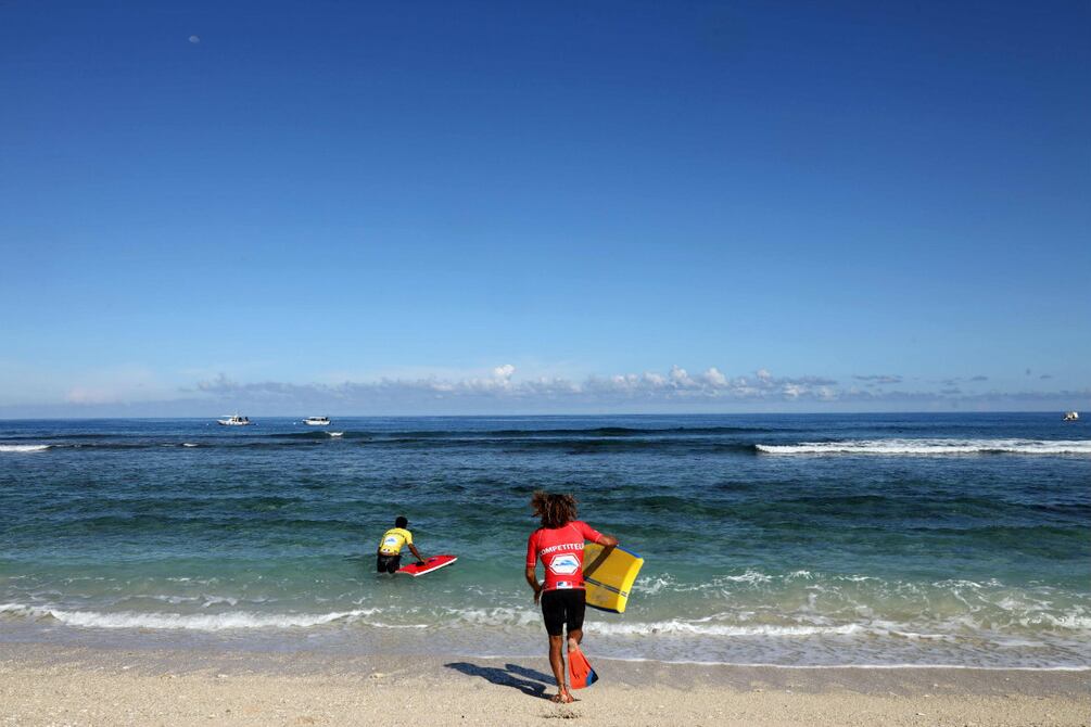 Sentado bajo su toldo en la playa, el "vigilante de tiburones" observa a los surfistas desafiar de nuevo las olas de agua color turquesa de la Reunión, la isla francesa del Océano Índico, donde este deporte revive a pesar del riesgo de los ataques de tiburones.