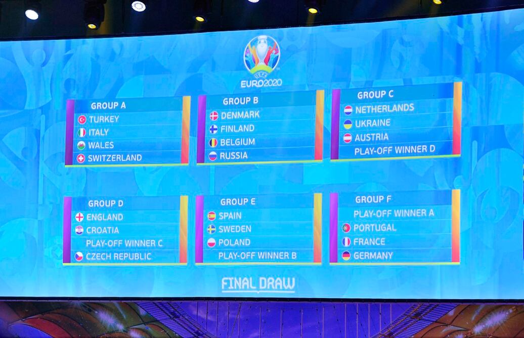 Resultado del sorteo de la fase final de la Eurocopa-2020, que se jugará del 12 de junio al 12 de julio, realizado este sábado en Bucarest.