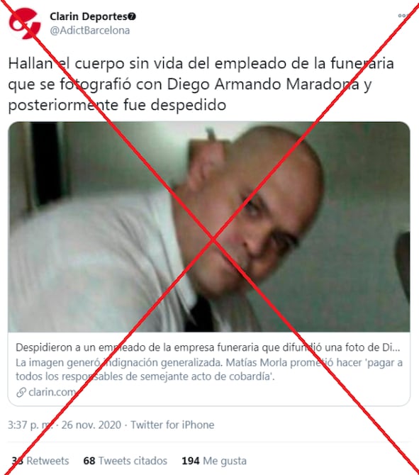 El tuit sobre la muerte de quien se fotografió con el cuerpo de Maradona es apócrifo y el video de un cuerpo que es sacado por la Policía de Buenos Aires de un contenedor de basura es viejo, comprobó AFP Factual.