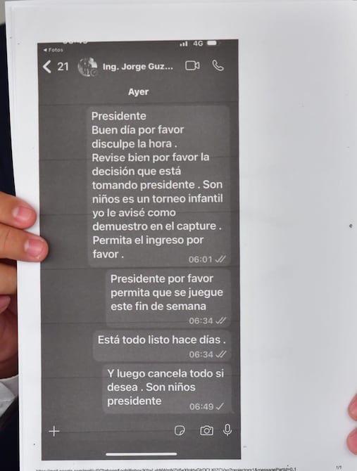 El abogado presentó capturas de mensajes enviados por Pisco al presidente azul, Jorge Guzmán Mancilla, solicitando explicaciones por el cierre del polideportivo. “Nunca respondió”, aseguraron.