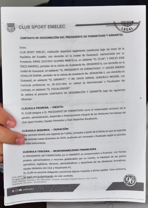 Según la defensa, el único documento válido es el firmado entre Pisco y Aguilar, cuando el primero presidía el Polideportivo Rocafuerte. Ese convenio contemplaba: