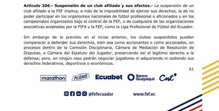 “La suspensión de un club afiliado a la FEF implica, a más de la imposibilidad de ejercer sus derechos, la de no poder participar en los organismos nacionales de fútbol profesional o aficionados y en los campeonatos organizados bajo el control de la FEF, o de cualquiera de las organizaciones asociativas aceptadas por la FIFA y la FEF, como la Liga Profesional de Fútbol del Ecuador”.