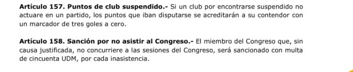 “Si un club por encontrarse suspendido no actuare en un partido, los puntos que iban disputarse se acreditarán a su contendor con un marcador de tres goles a cero”.