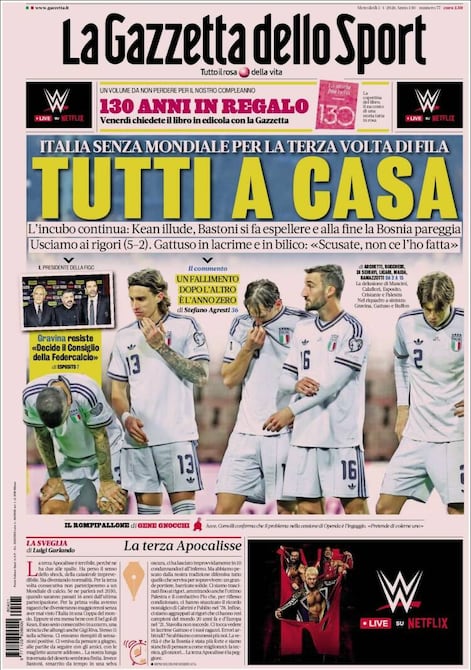 “El tercer apocalipsis es el peor de todos: la exclusión de Italia del Mundial se está convirtiendo en la norma. La catástrofe italiana ha perdido su carácter impactante; más que impredecible, parece ser lo usual. Por primera vez, toda una generación habrá crecido sin ver a Italia en un Mundial”, escribió Luigi Garlando, comentarista principal de La Gazzetta dello Sport. Y añadió: “Nuestro largo viaje por el desierto parecía haber terminado. En cambio, Bastoni, perdido en un bosque oscuro, nos dejó imprudentemente con diez hombres, condenándonos al infierno. Pero sacamos de nuestra tradición defensiva todo lo necesario para sobrevivir: un gran portero, barricadas sólidas. Nos arrastramos hasta los penaltis… La verdad es que Bosnia fue más fuerte, y estamos cansados de pensar en cómo mejorar: técnica, oradores...”