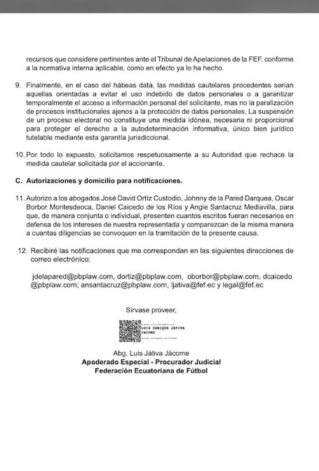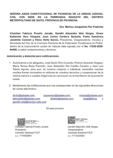 Los abogados que estarán a cargo de la defensa de la Federación Ecuatoriana de Fútbol (FEF) ante la acción de protección presentada, la cual suspendió de forma provisional las elecciones en el organismo, son parte del equipo legal del club Universidad Católica de Quito.