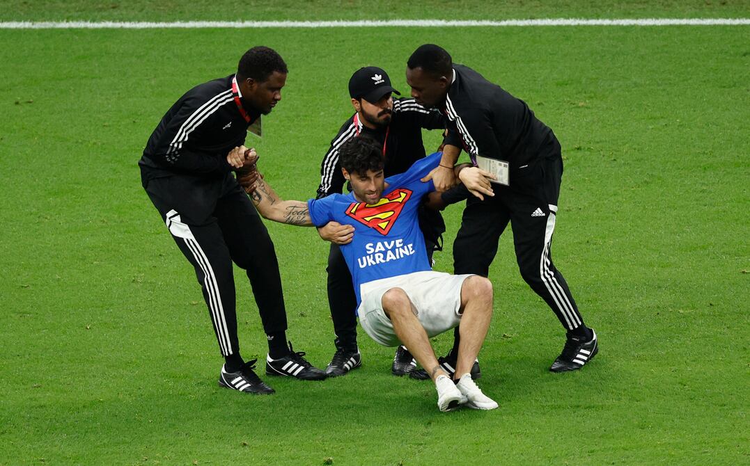 Un individuo con una bandera arcoíris y con un mensaje a favor de las mujeres iraníes y a favor de Ucrania en su camiseta, penetró en el césped durante el partido entre Portugal y Uruguay disputado este lunes en el Estadio Lusail. Luego se conoció que el manifestante es Mario Ferri, unl hombre de 35 años de edad, que enn redes sociales se identifica como “futbolista y pirata moderno”.