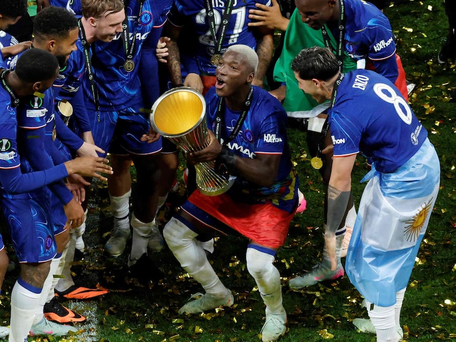Moisés Caicedo no olvidó sus raíces y en la celebración por la obtención del título de la UEFA Conference League con el Chelsea amarró la bandera de Ecuador a su cintura y así salió a recibir su medalla.