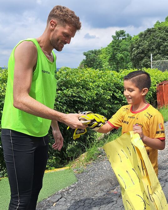 El arquero canario cumplió con el deseo de un niño que lo visitó en la práctica canaria de este miércoles.