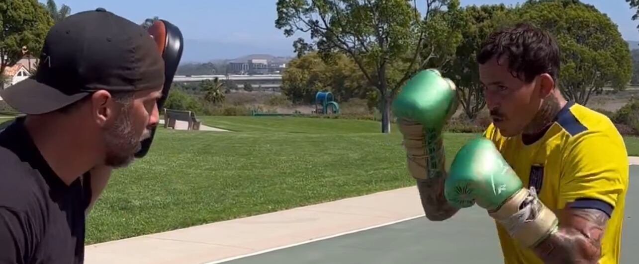 Vistiendo la camiseta de la Tricolor y usando zapatos de la marca Venus, Marlon Chito Vera realiza una sesión de entrenamiento con su coach Jason Parillo en la previa del partido de eliminatorias a la Copa Mundial FIFA de 2026 de la selección ecuatoriana ante su similar de Uruguay, celebrado el martes en el estadio Rodrigo Paz de Quito. Un homenaje del artemarcialista manabita al equipo nacional que se impuso por 2-1 con un doblete de Félix Torres.