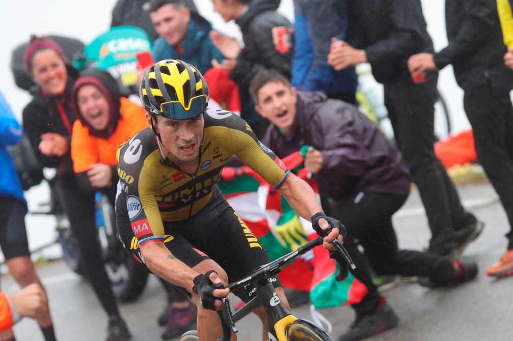 El esloveno Primoz Roglic (Jumbo Visma), ganador de etapa en Lagos de Covadonga y líder de la Vuelta a España, se mostró feliz en la línea de meta tras una jornada que el campeón olímpico contrarreloj disfrutó a pesar de la lluvia y del ataque a 60 kilómetros de meta del colombiano Egan Bernal.