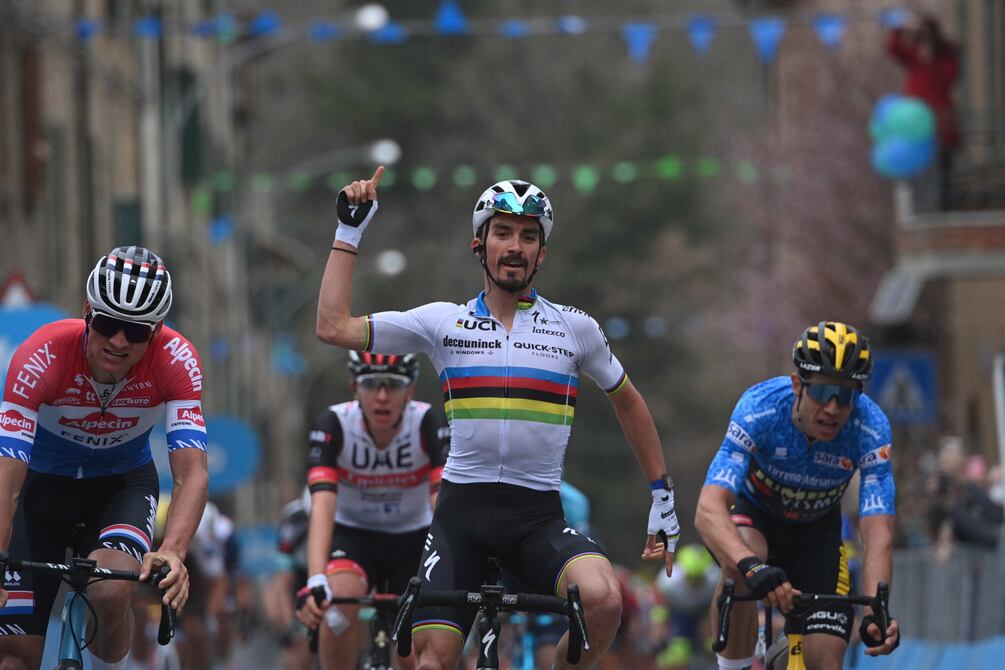 El francés Julian Alaphilippe (Deceuninck-Quick Step), campeón mundial en ruta, sacó a relucir el maillot arcoíris en un final espectacular para imponerse en la segunda etapa de la Tirreno Adriático, entre Camaiore y Chiusdino, con 202 kilómetros, en la que Wout van Aert (Jumbo-Visma) mantuvo el maillot azul de líder.