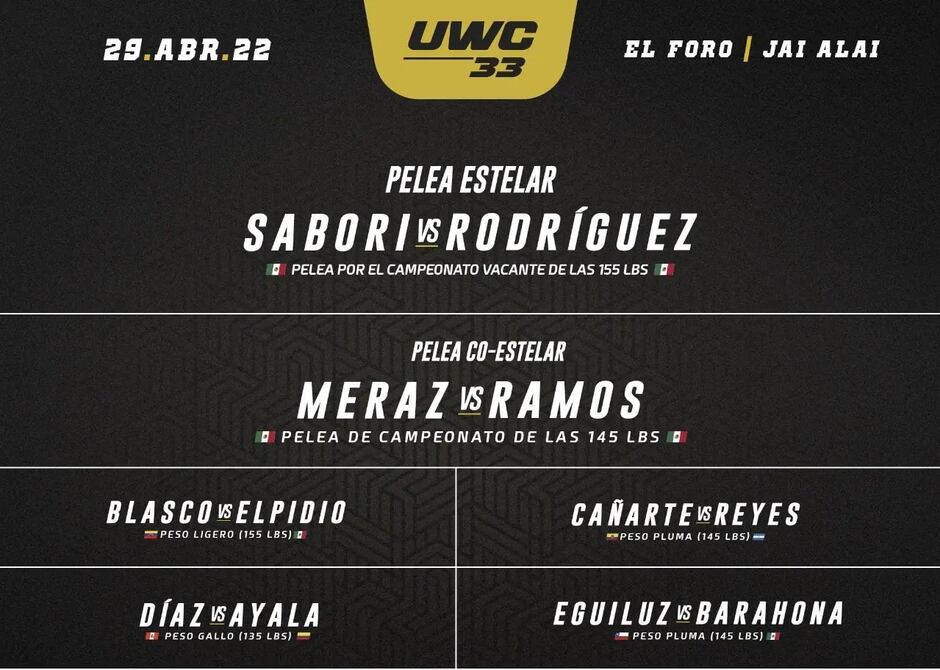 Uno de los seis combates programados para el main card de UWC 33 lo disputará el ecuatoriano Aarón Cañarte (8-0) contra el nicaragüense Walter Reyes (6-1-0), en un duelo de la división peso pluma, el próximo 29 de abril.