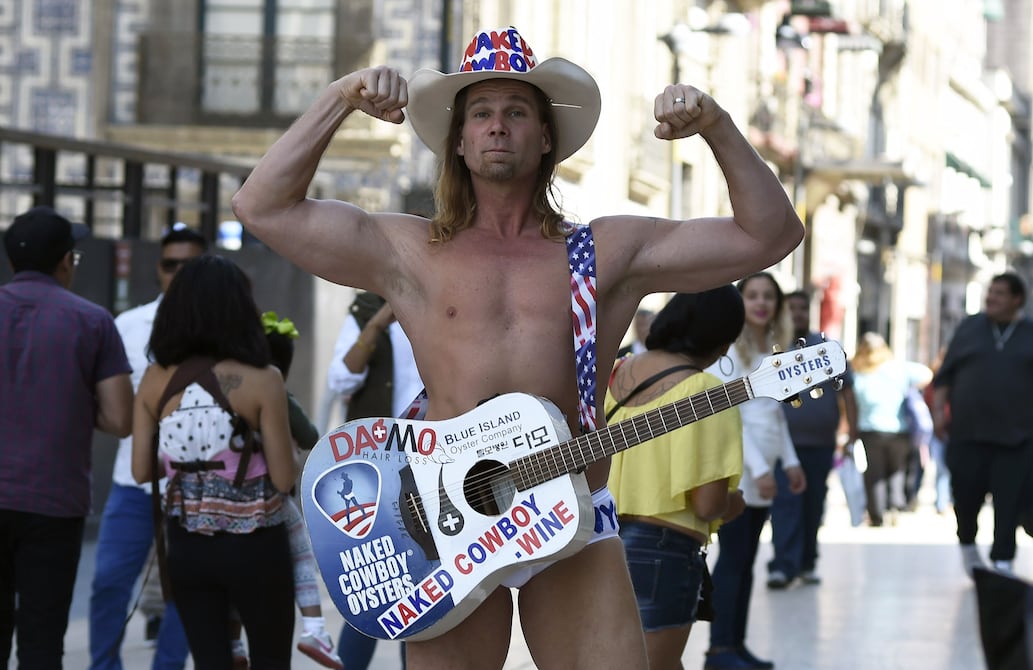 Con su musculoso cuerpo cubierto solo con unos ajustados calzoncillos blancos, portando sombrero y guitarra en mano, el "Naked Cowboy" (vaquero desnudo) cambió Times Square de Nueva York por el centro de México para cantar su amor al presidente estadounidense Donald Trump y su polémico muro.