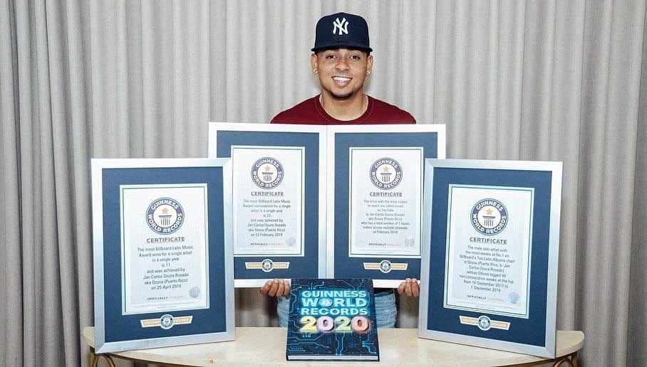 El cantante puertorriqueño Juan Carlos Ozuna Rosado, conocido en el mundo artístico como Ozuna, recibió cuatro títulos de Guinness World Records por sus logros musicales y con ello ingresó a la nueva edición del libro Guinness World Records 2020.