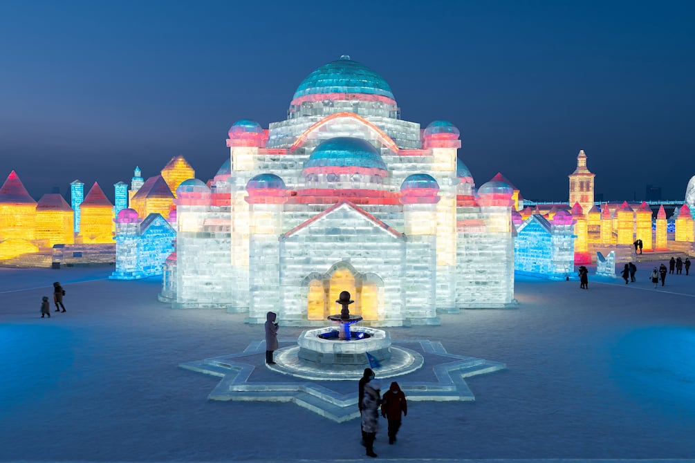 Gigantescos laberintos de nieve, torres heladas iluminadas y palacios de cristal creados a partir de grandes bloques de hielo deslumbran a los visitantes del 37.º Festival Internacional de Escultura de Hielo y Nieve de Harbin, situado al noreste de China, en la frontera con Rusia y de Siberia.
