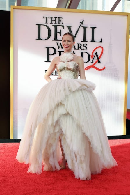 Blunt, también de 43 años, apareció con un vestido de tono claro y estilo romántico, con capas de tul superpuestas, mientras que Tucci, de 65 años, optó por un traje oscuro clásico con chaqueta de terciopelo, en línea con su personaje como mentor en el mundo de la moda.