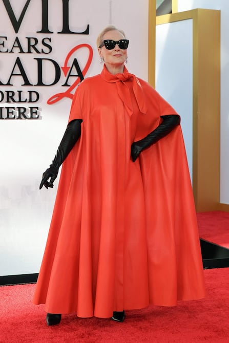 Streep, de 76 años, retomó su papel como Miranda Priestley, la exigente directora de Runway, y asistió con un vestido-capa en tono naranja, acompañado de guantes largos negros, zapatos a juego y gafas de sol de gran tamaño.