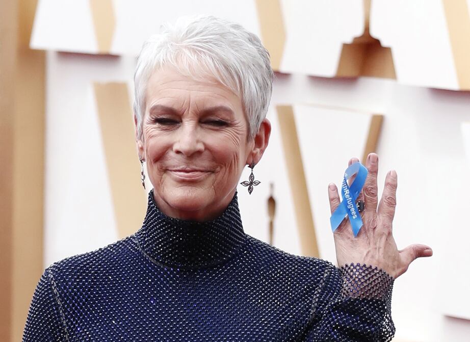 Entre los asistentes a la ceremonia, como Jamie Lee Curtis, lucieron pines con la bandera de Ucrania en la solapa o lazos azules.