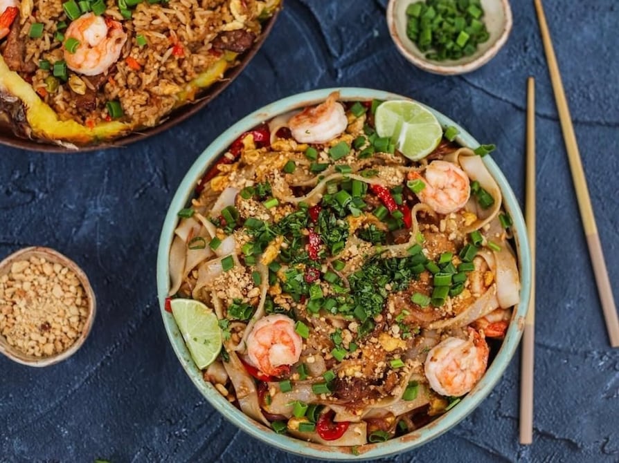 El pad thai, plato ícono de la cocina tailandesa, salteado en wok, a base de fideos de arroz con huevo, salsa de pescado, pasta de tamarindo y brotes de soya, camarones, pollo, maní picado y brotes verdes de ajo, con una rodaja de lima, añadiéndole el jugo de esta fruta al plato como condimento.