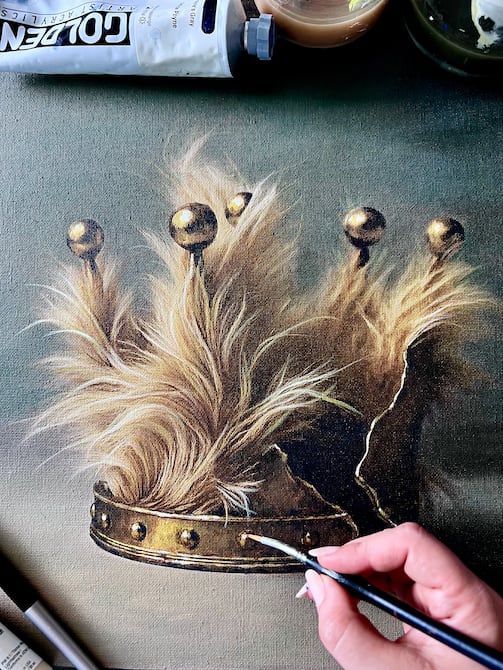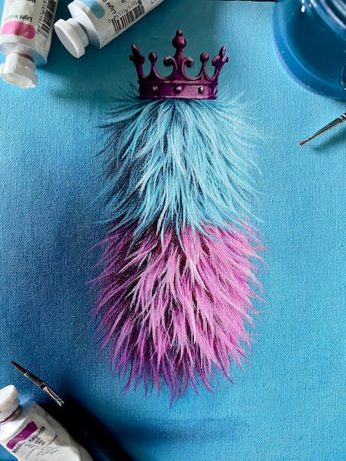 Las pastillas se convirtieron en coronas, para sugerir todo aquello que nos decimos a nosotros mismos para sobrevivir. "Empecé a tomar cosas en mi casa, una vela, una caja, y a pintar rayitas. Fue como un acto terapéutico que me ayudó a salir del hueco y a retomar mi vida”. Eso, a lo que llama la suavidad de la pintura, se trasladó a la obra en forma de un pelaje esponjoso en rosados y fucsias que recubría las pastillas.