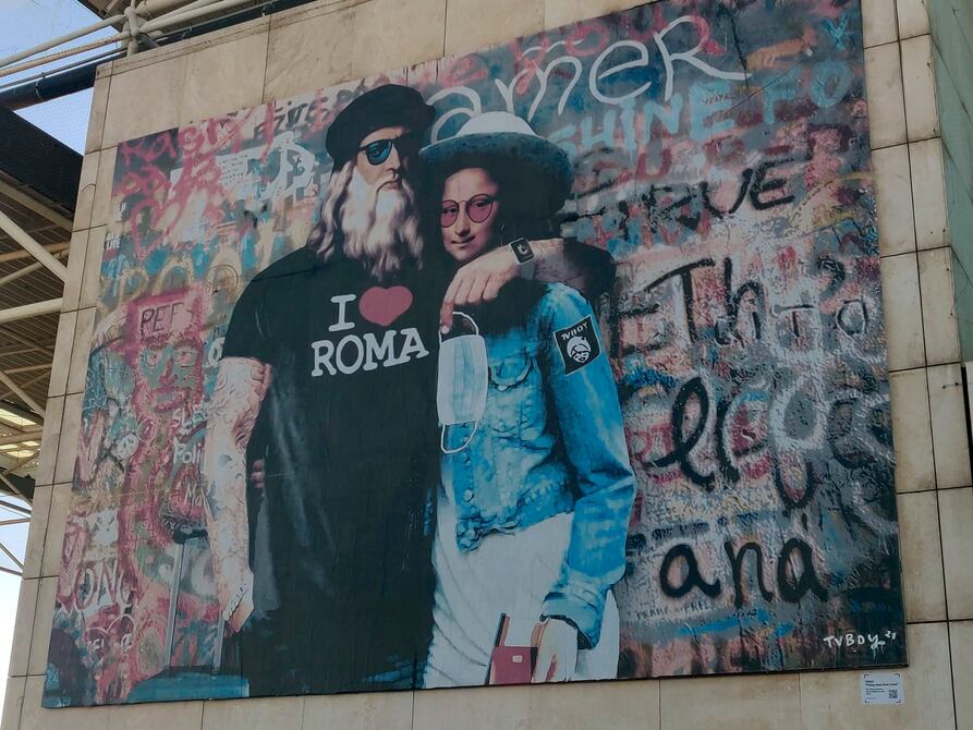 El artista urbano TVBoy pintó hoy en la Terminal 1 del aeropuerto romano de Fiumicino un mural que representa a Leonardo da Vinci y la Mona Lisa ataviados como turistas para celebrar la progresiva vuelta a la normalidad tras la pandemia de COVID-19 y enviar una señal de esperanza.
