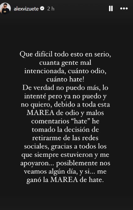 “Qué difícil todo esto en serio, cuanta gente mal intencionada, cuánto odio, cuánto hate! De verdad no puedo más y no quiero, debido a toda esta MAREA de odio y malos comentarios “hate”, he tomado la decisión de retirarme de las redes sociales”, se lee en la primera parte de su publicación.